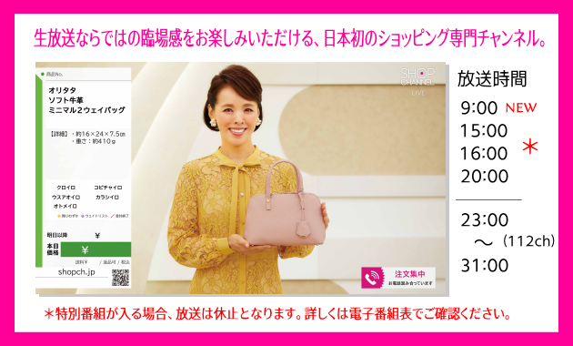 ―内 容― 24時間365日、生放送でお楽しみいただけるショッピング専門チャンネル。個性豊かなゲストやキャストたちが軽快なトークで世界中から厳選した商品をご紹介。ご注文は24時間いつでもOK。 ショップチャンネルは番組と商品を通じて、あなたに「心おどる、瞬間を」お届けいたします。 |